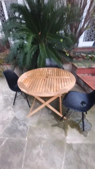 NO NEGOCIABLE Sólo 3 meses desde su compra. Recogida cerca del Hospital Sagrado Corazon (Barcelona) Conjunto de mesa y dos sillas plegables, ideal para espacios exteriores. Dimensiones mesa: 75x63cm - Estructura de madera resistente. - Diseño plegable para fácil almacenamiento. - Tablero de mesa con lamas.
