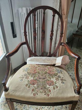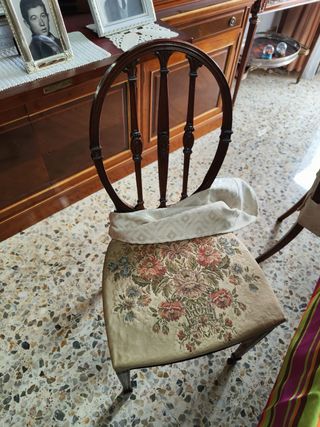 Conjunto de seis sillas de comedor con un diseño clásico y elegante. Son 4 sillas y 2 sillones de cabecera. - Tapicería floral en el asiento. - Estructura de madera oscura. - Respaldo ovalado con detalles tallados. Están en perfecto estado. Tienen la firma de la casa de loscertales. ⚠️ No se hacen envíos, solo venta en persona. Escucho ofertas.