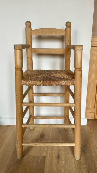 Silla de madera con asiento de mimbre, ideal para niños o como elemento decorativo. - Estructura de madera resistente. - Asiento tejido de mimbre.