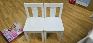 Dos Sillas blancas de madera para niños. Tienen algunas marcas del uso. Cada una 6€ o las dos por 10€
