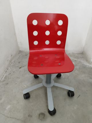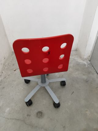 Silla de estudio de madera de color roja, tamaño para niños, con base metalica, con ruedas. - Asiento y respaldo en color rojo brillante. - Base de cinco patas con ruedas para fácil movilidad. - Estructura con perforaciones decorativas en el respaldo. - Base giratoria.