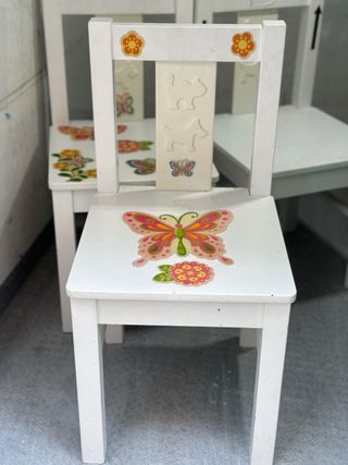 Conjunto de sillas de madera para niños con bonitos diseños. - Decoradas con mariposas y flores. - Respaldo con siluetas de animales.