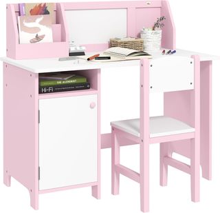 CONJUNTO DE 2 PIEZAS: Este conjunto para niños incluye una mesa (90L x 45P x 85A cm) y una silla (29L x 29P x 66A cm) en MDF y madera de pino, diseñado para actividades como estudio, lectura y juego. La pizarra blanca integrada estimula la creatividad. Amplio espacio de almacenamiento para mantener el ambiente ordenado. Estructura robusta con esquinas redondeadas para mayor seguridad. Montaje necesario. Capacidad de peso: 30 kg (mesa), 50 kg (silla). Edad recomendada: 5-8 años. Certificaciones EN71-1-2-3. Incluye: 1 mesa, 1 silla, manual de instrucciones. Color: Blanco y rosa.