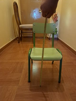 Es la tradicional silla de pueblo. La grande es bajita. El asiento está a 40 cm. de altura y con el respaldo mide 84 cm. de altura en total. La pequeña es aún más bajita, para niños. El asiento está un poco roto, como se ve en la última fotografía. Serían 7 € la grande y 2 € la pequeña. Se recogerían en Vicálvaro. Hay más sillas en mi perfil. Si nadie las quiere, las quitaré en una semana.