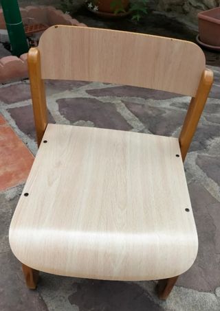 De madera maciza . Tengo dos iguales. Cada una a 15 euros si te llevas las dos te las dejo a 12 cada una. Preciosas para habitación infantil. Medida respaldo la madera sin medir el hueco 21 cm Medida altura total 48 cm. Para niños desde 1 añito más o menos hasta 3 o 4 años. Para leer o sentarse.para niño pequeño. Entrega en Madrid
