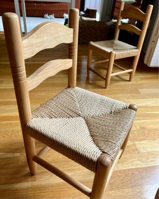 Silla infantil de madera con asiento tejido Cómoda y de muy buena calidad Medidas Alto 90 centímetros Fondo 32 centímetros Ancho 40 centímetros Ideal como silla de adaptación para cuando dejan la trona, para comer o hacer sus tareas en la mesa de la cocina o comedor (si no quieres comprar mesitas infantiles) Le vendría bien una mano de barniz o pintura pero de estructura está IMPECABLE! 🚨🚨 ATENCIÓN ENTREGA SÓLO EN MANO EN OURENSE O EN MADRID PRINCIPE PÍO 🚨🚨NO COMPRAR NO ENVÍO Oportunidad oferta buen precio ocasión venta por mudanza silla infantil niño niña trona estilo natural artesanía boho minimalista vintag