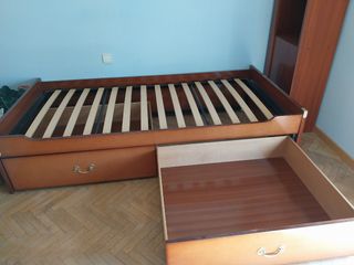 Conjunto de muebles de madera para dormitorio. Incluye armario, cama con cabecero decorado, mesita de noche y escritorio con silla. Se conserva en buen estado. - Armario de madera con puertas y cajones. - Cama individual con cabecero de madera tallada y pintada. - Mesita de noche a juego. - Escritorio con silla. ❓️ Preguntar por más detalles