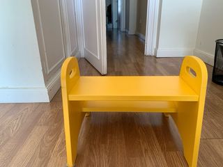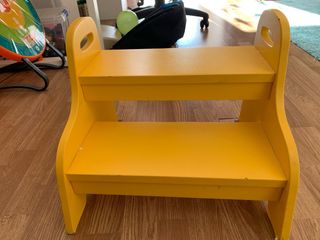 Práctico taburete escalón de madera para niños. Ideal para ayudarles a alcanzar lugares más altos. El escalón mas alto esta a 24 cm del suelo. - Diseño de dos peldaños. - Laterales con asas para facilitar el transporte. - Acabado en color amarillo vivo. Hay 1 disponible