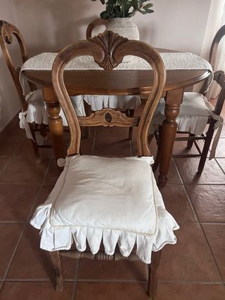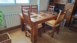 Conjunto de mesa de comedor con cuatro sillas a juego. - Diseño rústico y elegante. - Ideal para espacios familiares. Lo compre hace unos pocos meses y esta como nuevo sin ningún arañazo.