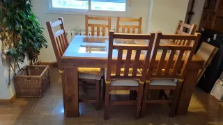 Conjunto de mesa de comedor con diseño rústico y seis sillas a juego. - Mesa con sobre de cristal. - Estructura de madera maciza. - Seis sillas de madera con cojines. - Estilo rústico y robusto.