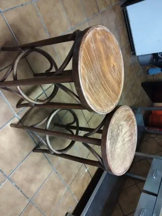 Conjunto de dos taburetes altos de madera maciza con un diseño rústico. - Construcción robusta en madera. - Asiento y estructura sólida. - Ideal para barras o mesas altas. Está barnizado recientemente pero las patas presentan imperfecciones, las iba a cortar pero al final no me vienen bien para lo que los quería.