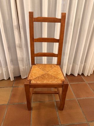 Conjunto de sillas de madera con un diseño rústico y cálido. Dispongo de 4 unidades. Precio por las 4 - Fabricadas en madera de pino. - Estilo ladder back (espaldera de escalera). - Asientos cómodos y robustos.