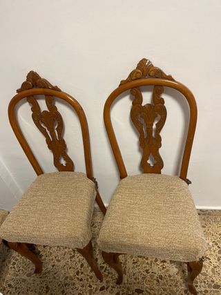 Conjunto de dos sillas antiguas con estructura de madera para restaurar. Ideales para un proyecto de bricolaje o decoración rústica. Se encuentran en buen estado para su edad, aunque muestran señales de desgaste. Perfectas para darles una segunda vida. - Estructura de madera. - Asientos desgastados. - Diseño clásico y rústico.
