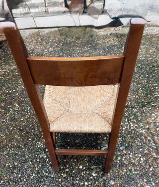 Conjunto de sillas de madera con un diseño rústico y asiento de cuerda. - Estructura principal de madera. - Asiento tejido con cuerda. 12€ la unidad. (Tengo 26 disponibles)