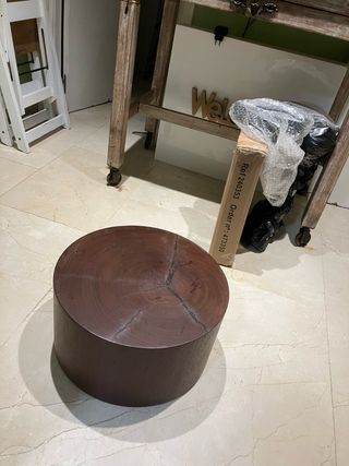 Este taburete de madera simula un tocón de árbol es un accesorio versátil para tu hogar. - 40cm diámetro - Diseño cilíndrico. - Acabado rústico con vetas visibles. artículo exposición tienda
