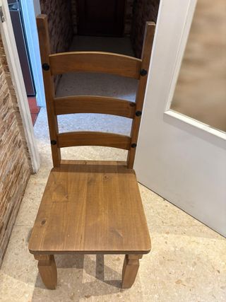 Conjunto de sillas de madera con un diseño rústico y un asiento de esparto. - Estructura de madera maciza. - Asiento tejido en esparto. - Respaldo tallado con detalles. Cada silla 30€, pro si te quedas las 4 sillas el precio total es 100€.