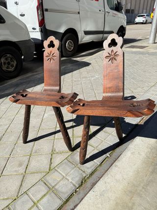 Conjunto de dos sillas de estilo rústico, perfectas para añadir un toque tradicional a tu hogar. - Diseño tallado en el respaldo. - Asiento con detalles decorativos. - Patas robustas. A una de ellas le falta una pata Se puede vender por separado 20€ 3 patas 10€ 2 patas Medidas: 70cm de alto, 40cm altura del asiento y 49cm de ancho.