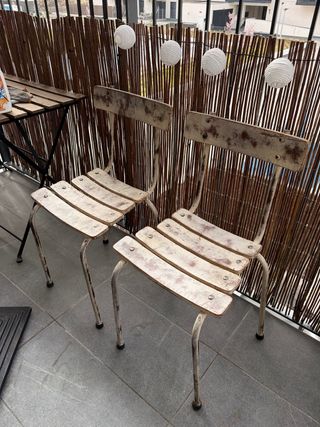 Sillas de madera antiguas plegables perfectas para dar un toque rústico a tu balcón o jardín. Antiguas pero en buen estado, ideales para pintarlas a tu gusto. Se venden en conjunto.