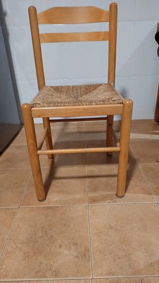 Preciosa silla de madera con asiento de mimbre. Ideal para darle un toque rústico a tu hogar. - Estructura de madera robusta. - Asiento tejido a mano de mimbre. - Diseño clásico y elegante. - Una por 10€ y las 5 por 45€
