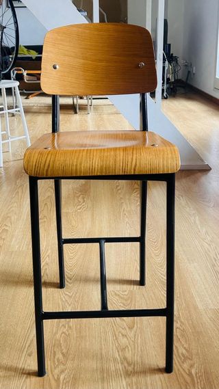 Vendo sillas taburete estilo Jean Prouvé (inspiradas en el diseño Standard clásico), con estructura de metal y asiento de madera de diseño vintage/industrial ideales para cocina, barra o comedor.  Medidas: Alto total: ~110 cm Alto asiento: ~76 cm Ancho: ~41–42 cm Fondo: ~48 cm  Tienen pequeñas marcas de uso, las cuales se muestran claramente en las últimas fotos, pero están en muy buen estado general y son cómodas. Precio por unidad: 50€