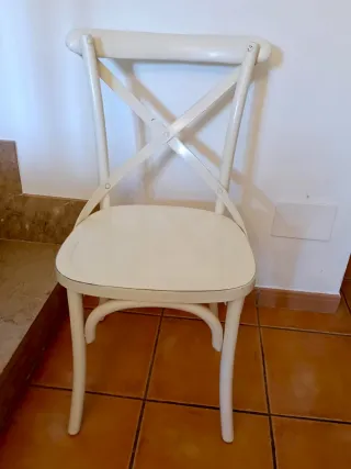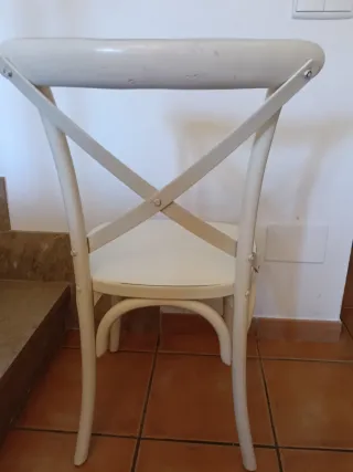Conjunto de sillas de estilo vintage, perfectas para dar un toque especial a tu hogar. - Diseño clásico con respaldo cruzado. - Patas curvas y asiento cómodo. - Acabado en blanco mate. Tengo 4, pero en una está roto el respaldo, por eso se regala. El precio es por silla.