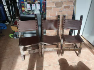Conjunto de tres sillas de estilo vintage, con una estructura de madera y asientos y respaldos de piel. - Diseño clásico y robusto. - Piel de alta calidad. - Ideal para dar un toque rústico a cualquier espacio.