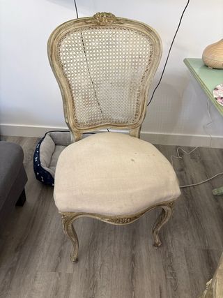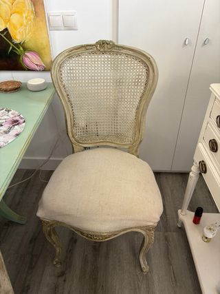 Elegantes sillas de estilo vintage, perfectas para añadir un toque clásico a tu hogar. - Estructura de madera con detalles dorados. - Asiento tapizado en tela beige. - Respaldo de ratán tejido. 25€ cada silla son 4