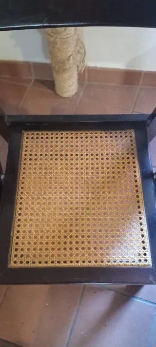 Conjunto de 6 sillas de estilo vintage, perfectas para añadir un toque clásico a tu hogar. El precio es por sillas,25 euros cada una - Diseño con respaldo de ratán. - Patas y estructura de madera.