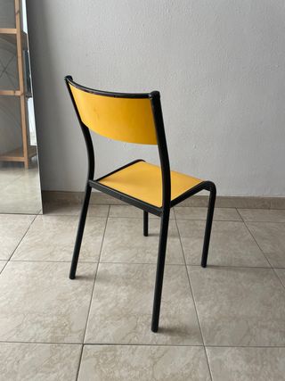 Silla de diseño vintage con asiento y respaldo en color amarillo. - Estructura de metal negro. - Asiento y respaldo de madera amarillo.
