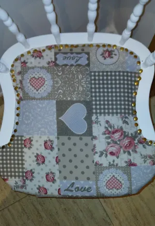 Silla estilo Capitán Windsor, restaurada con un encantador tapizado patchwork. - Diseño único con motivos de corazones, flores y la palabra Love. - Patas y estructura de madera pintadas en blanco. -No dudes en contactar si tienes alguna duda o quieres ver más fotos. Entrega en mano en zona Opañel. #silla #capitan #windsor #shabbychic #vintage #restaurada #tapizada #patchwork #decoracion #hogar #mueble #retro #unico #corazones #rosas #craft