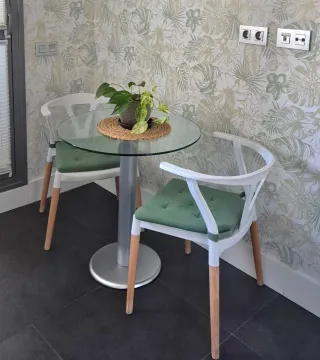 Conjunto de mesa redonda con tapa de cristal y dos sillas. - Mesa con base metálica de aluminio y tapa de cristal templado. - Sillas blancas de resina, con patas color madera. Ligeras. Incluye los cojines verdes.