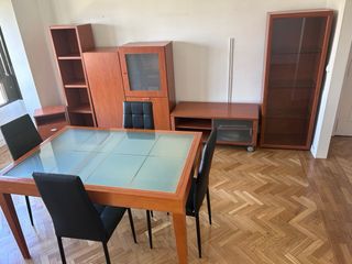 Conjunto de muebles de salón en tonos madera y detalles de cristal. - Mueble vitrina con estantes interiores. - Mueble bajo con compartimentos. - Mueble almacenaje con dos puertas. - Estanteria. - Mesa con 6 sillas. - Mueble bar con zona de almacenaje.