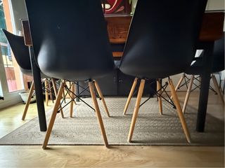 Conjunto de sillas de comedor con un diseño moderno y elegante. - Patas de hierro negro. - Asiento y respaldo de madera oscura con veta marcada. - 6 unidades - 15€ cada