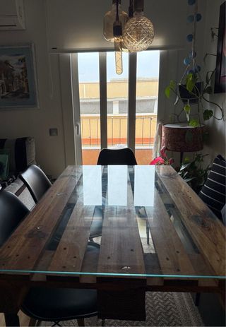 Vendo el comedor completo: Son 4 sillas negras Una mesa hecha con estructura de metal, base de madera (palet) y cristal de buen grosor y buena calidad. (120*80*80cm) hay foto. Banco para 3 personas con espacio de almacenaje (cojines no incluidos)