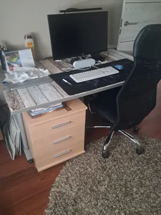 Conjunto de escritorio y silla de oficina. Solo se uso dos veces unas horas ,lo vendo por que necesito uno más grande ,mando más fotos u videos por privado si se necesita , recogida de mi domicilio - Escritorio de color negro. - Silla de oficina con asiento y respaldo. Comprados en octubre del año pasado solo dos usos lo vendo por que necesito uno más grande