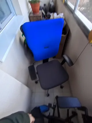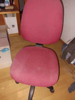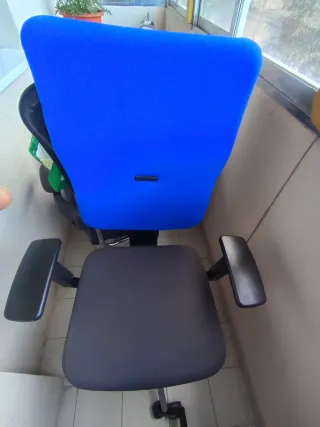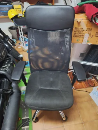 Silla de oficina giratoria con base de cinco patas y ruedas. Es muy cómoda para pasar el día trabajando la verdad. Es muy usada y tiene señales de desgaste como se pueden ver en las fotos.