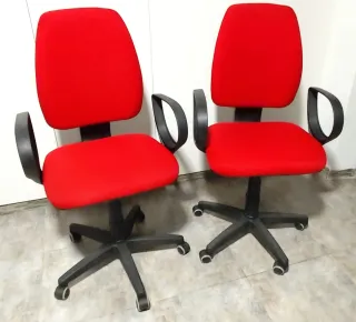 Dos silla de oficina con un diseño moderno y cómodo en perfectas condiciones. -Tapicería de tela en color rojo. -Base y brazos de plástico en color negro. -Respaldo inclinable. -Posabrazos ergonómico. -Asiento regulable. -Ruedas para facilitar el movimiento. -Precio 50€ -La Algaba (Sevilla)