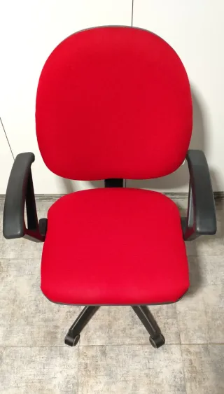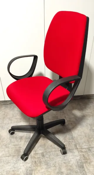 Silla de oficina con un diseño moderno y cómodo en perfectas condiciones. -Tapicería de tela en color rojo. -Base y brazos de plástico en color negro. -Respaldo inclinable. -Posabrazos ergonómico. -Asiento regulable. -Ruedas para facilitar el movimiento. -Precio 30€ -La Algaba (Sevilla)