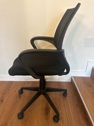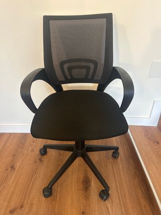 Vendo silla de oficina negra, muy cómoda, con respaldo de rejilla y asiento acolchado. Se sube y baja (altura regulable) y tiene ruedas. En muy buen estado, perfecta para teletrabajo o estudio.