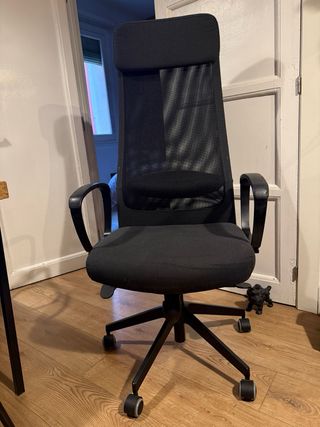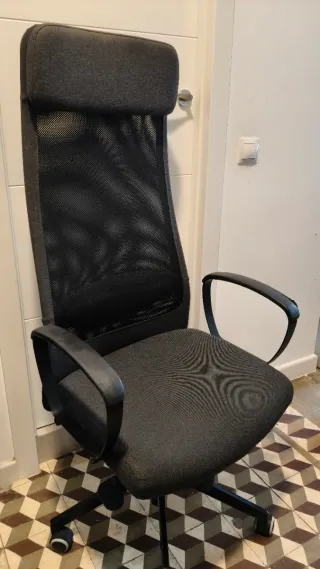 Silla de oficina ergonómica de la marca Ikea, modelo Markus. - Respaldo alto con malla transpirable. - Asiento acolchado. - Base con ruedas para fácil movilidad. Tiene marcas de uso, ver fotos. Reposabrazos nunca utilizados, he perdido los tornillos.