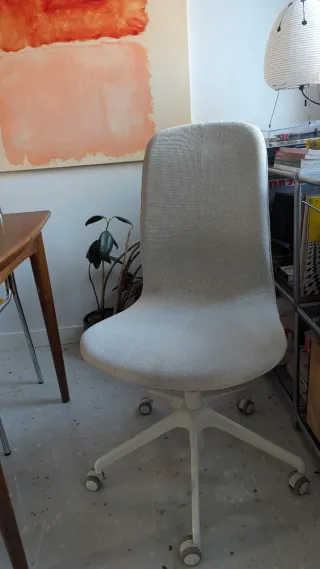 Silla de oficina modelo LANGFJALL de IKEA, diseñada para ofrecer comodidad sin ruedas. - Base de cuatro patas, - Brazos curvos integrados en la estructura. - Respaldo alto y asiento ergonómico. Uso para teletrabajo ocasional. Tiene 4 años. Venta por mudanza. En la foto se pueden apreciar un par de sombras por manchas de agua (juraría). No he intentado quitarlas.