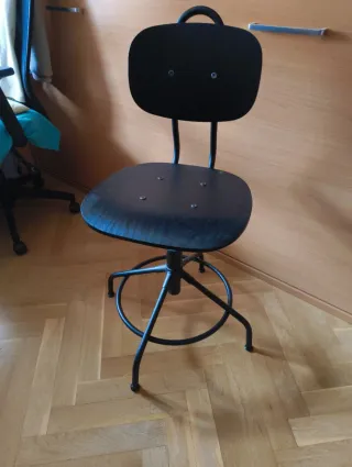 Silla de oficina Ikea en color negro, piel sintética. La piel está gastada, así que le he puesto una funda de tela. Es cómoda y sólida, y funciona bien el ajuste de altura. Le queda bastante vida, ideal para un entorno donde no importe mucho el aspecto (taller, estudio, etc.). - Tapicería de tela. - Base con ruedas para fácil movilidad.