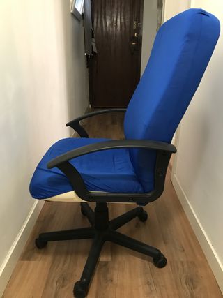 Sillón de escritorio color beige con funda azul porque la poli piel del asiento está un poco despellejada no obstante la sentada está perfecta, muy muy cómodo, ajustable en altura y con ruedas para desplazarse.