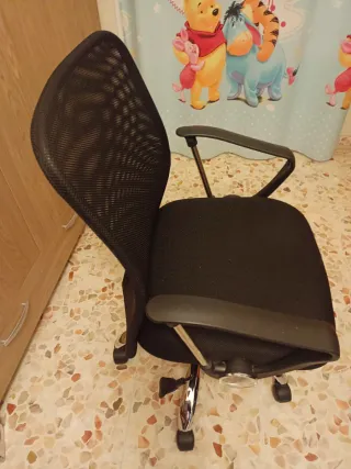 Silla de despacho con un diseño moderno y funcional. VENDO DOS: 1 por 30€, 2 por 55€ - Respaldo de malla transpirable. - Asiento acolchado para mayor comodidad. - Base giratoria con ruedas para fácil movilidad. - Brazos ergonómicos.
