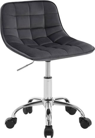 Silla de oficina o tocador con un diseño moderno y acolchado. - Tapicería de terciopelo. - Base cromada con ruedas. - Altura regulable. WOLTU Silla de Oficina, Taburete Tocador Giratorio, Silla Ergonómica Escritorio con Respaldo, Taburete Bajo con Asiento Ajustable de Altura, Asiento Tapizado en Terciopelo, Gris Oscuro.