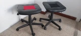 Se venden dos taburetes de oficina con un diseño moderno. Los dos 50€, uno solo 30€ - Asiento acolchado con detalles en rojo y negro. - Base de plástico resistente con ruedas. - Altura regulable.