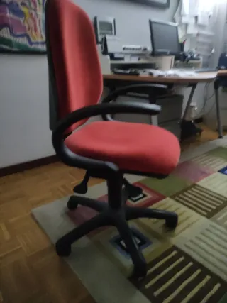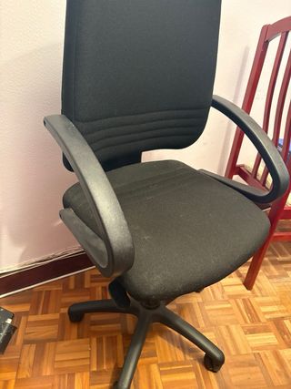 Silla de oficina con asiento y respaldo tapizados. - Base de cinco radios con ruedas. - Reposabrazos. - Altura regulable. - Posición de respaldo adaptable Tiene manchas de uso (nada que no se pueda limpiar). Se ven en las fotos.