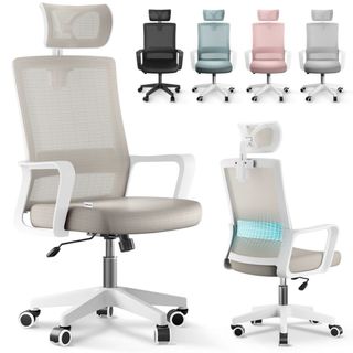 Silla de oficina con diseño ergonómico y reposacabezas. - Respaldo de malla transpirable. - Asiento acolchado. - Brazos ajustables. - Base con ruedas para fácil movilidad.