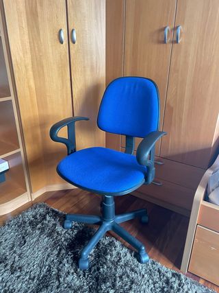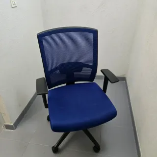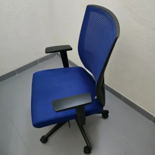 Silla de oficina con un diseño moderno y funcional. - Asiento y respaldo en tela azul. - Base y brazos en metal y plástico negro. Está en buen estado, aunque la tela tiene algúnos signos de uso.