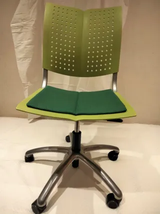Vendo silla de oficina marca HAG modelo Conventio Wing 9822. Ligera y estable. Color verde. Función de balanceo fluido y equilibrado hacia adelante y hacia atrás. Tapicería desenfundable en asiento, respaldo de plástico y base de aluminio de 5 radios con ruedas universales negras giratorias de 65 mm de diámetro aptas para superficies duras y blancas. Elevación del cilindro a gas de 150 mm. Altura del asiento 380 – 520 mm. Altura silla 850- 1002 mm. Profundidad asiento 430 mm. Inclinación respaldo 14 grados. Estado impecable.